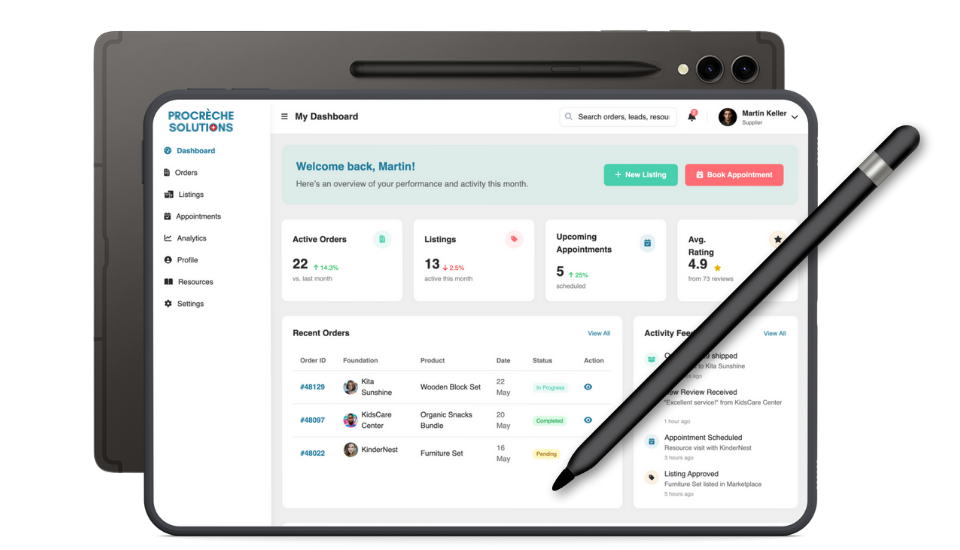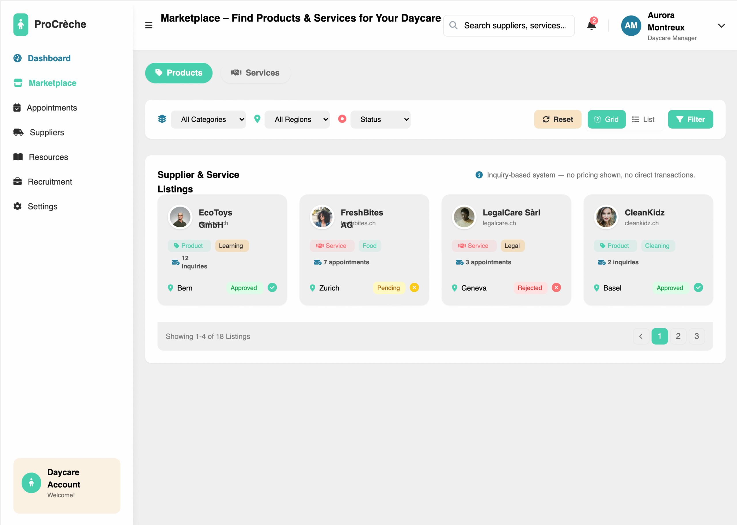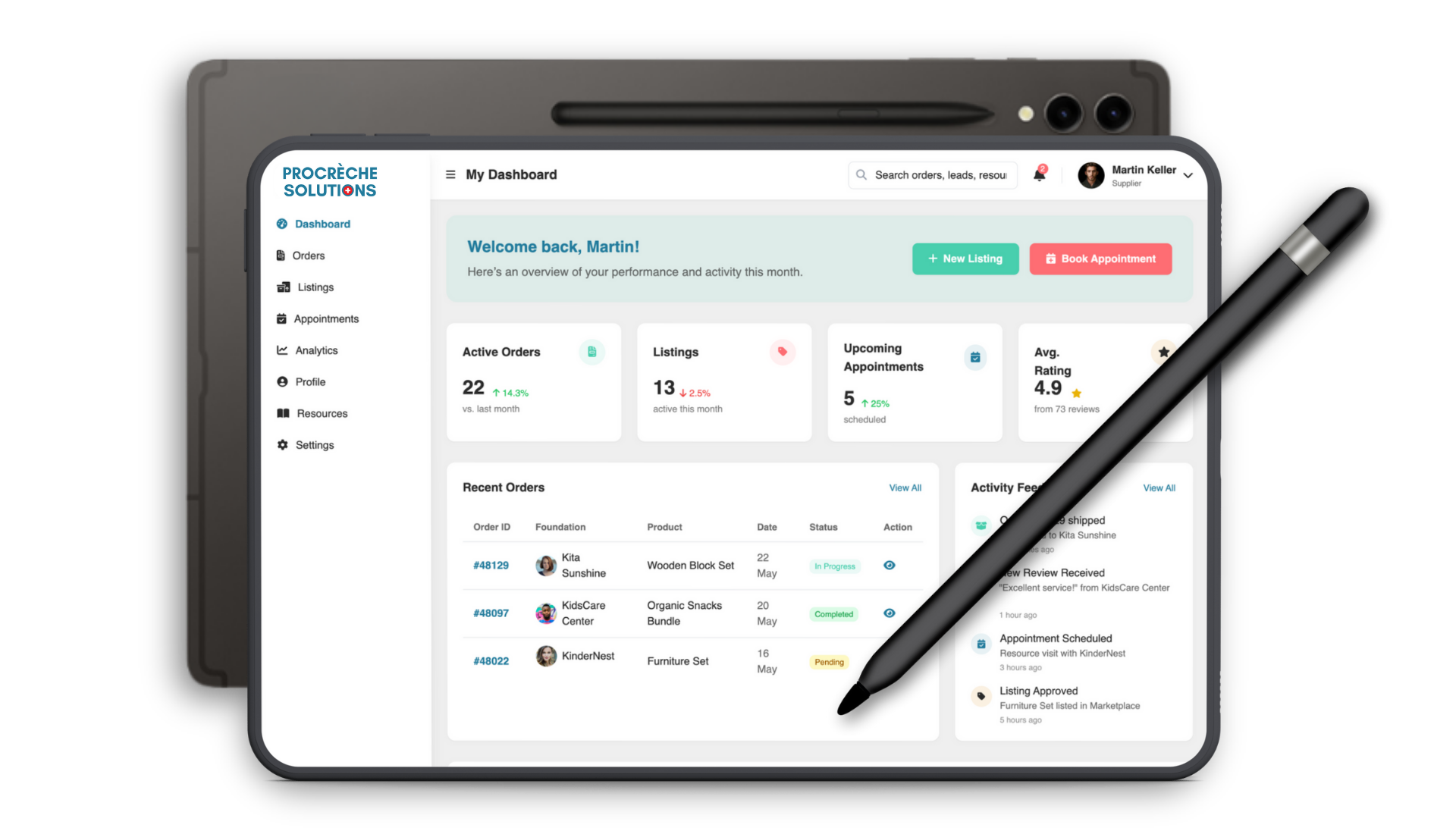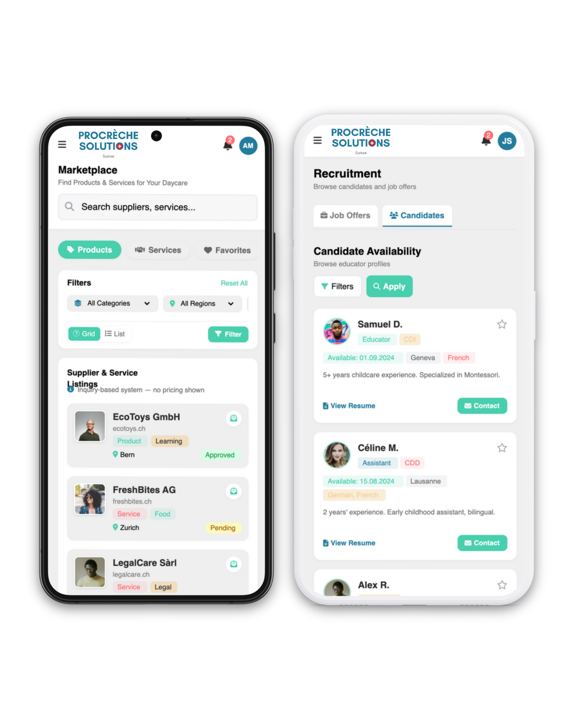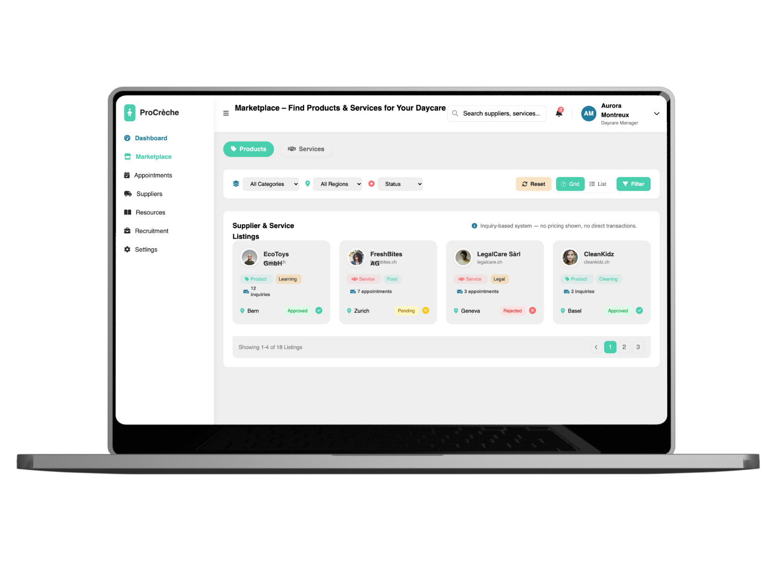Suppliers, parents, and educators connected in one ecosystem - trusted by Swiss daycares and suppliers to streamline operations, communication, and care.