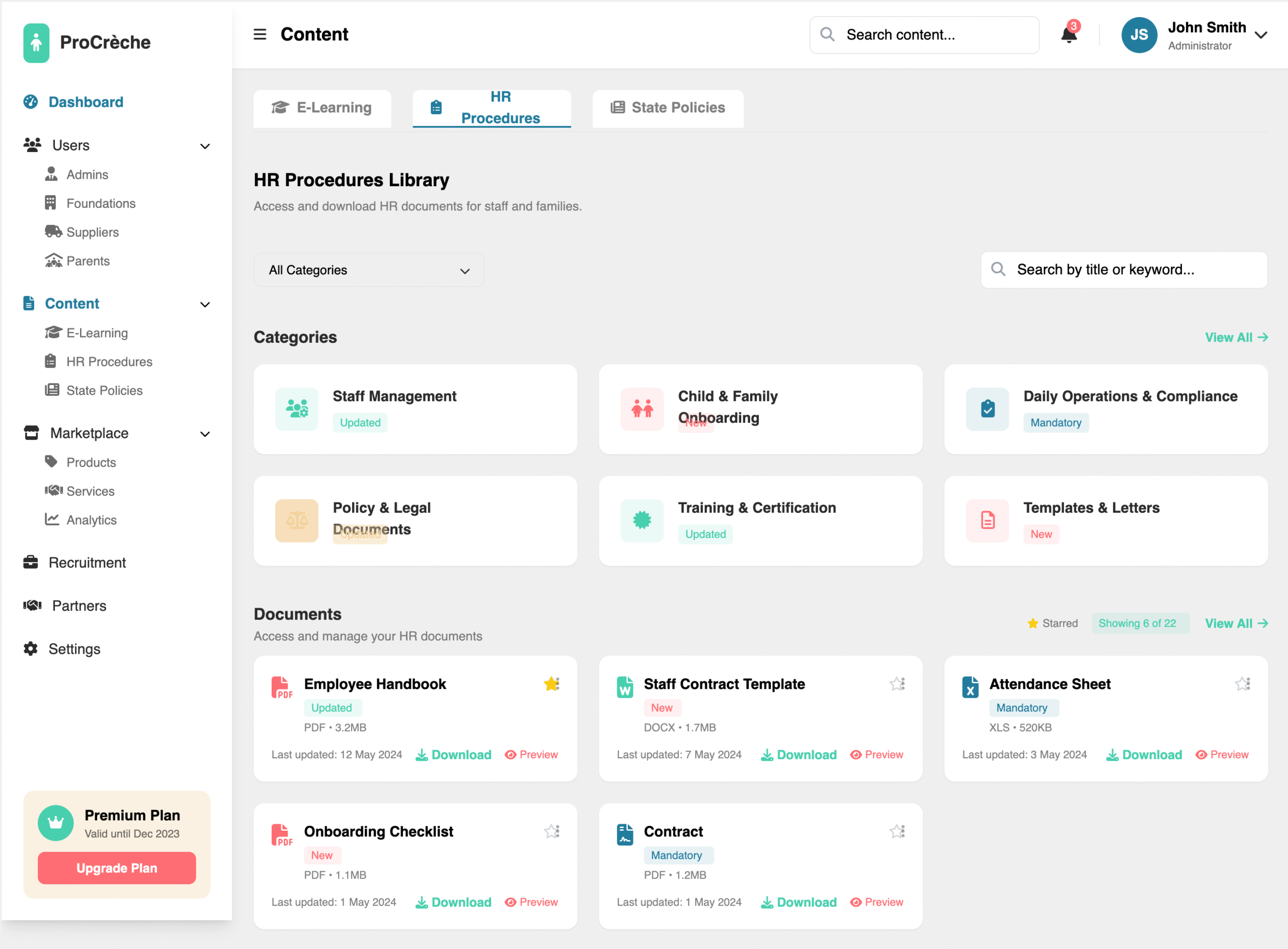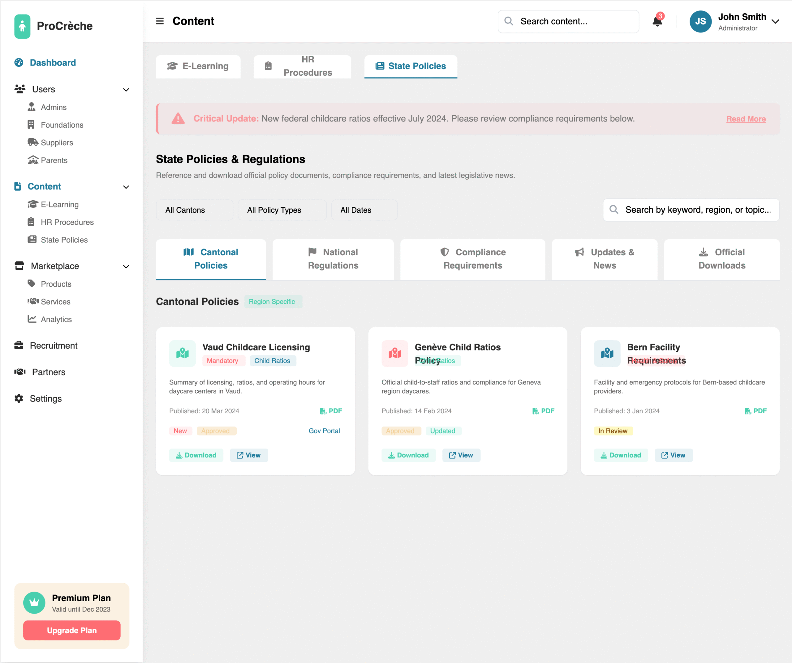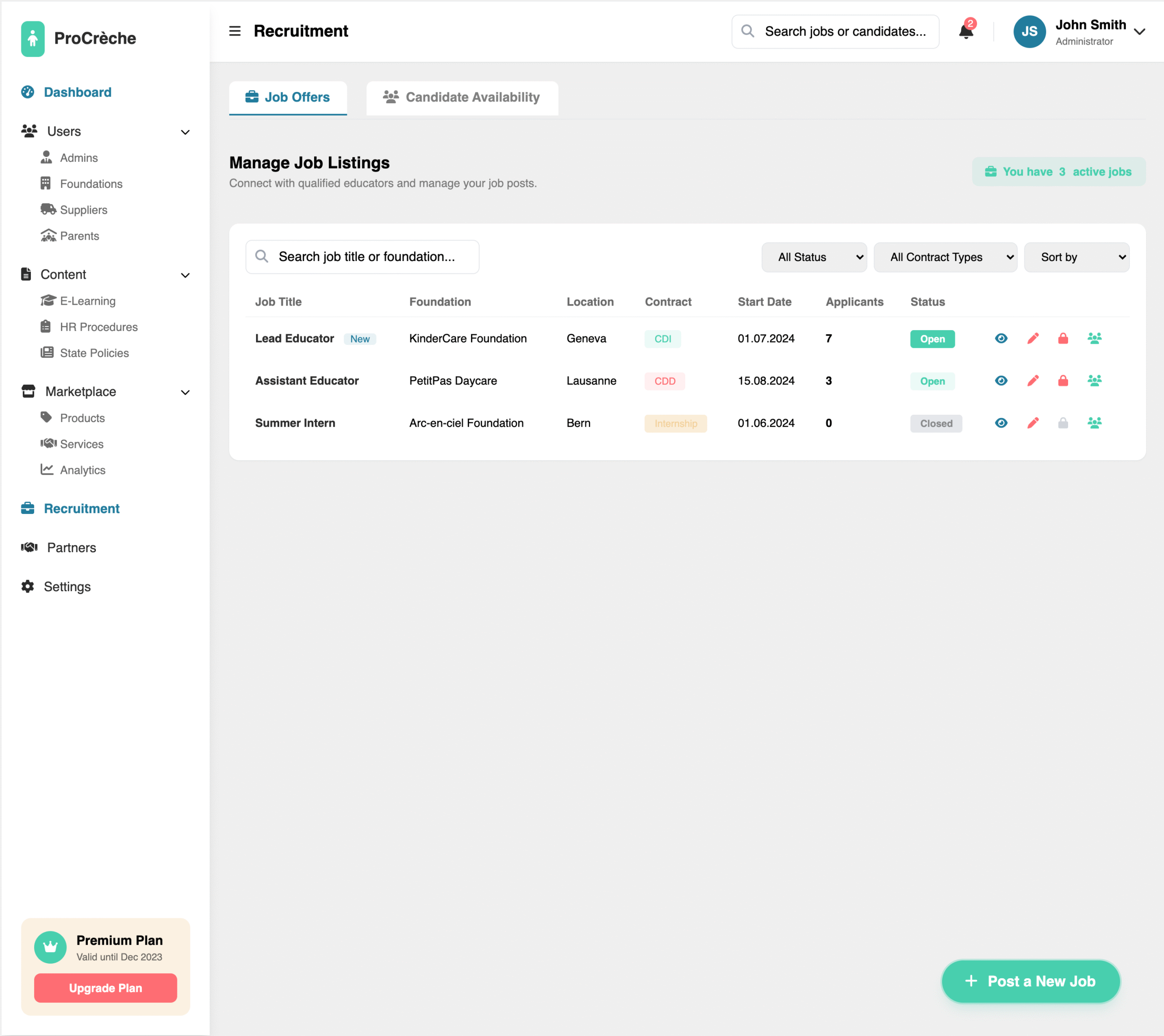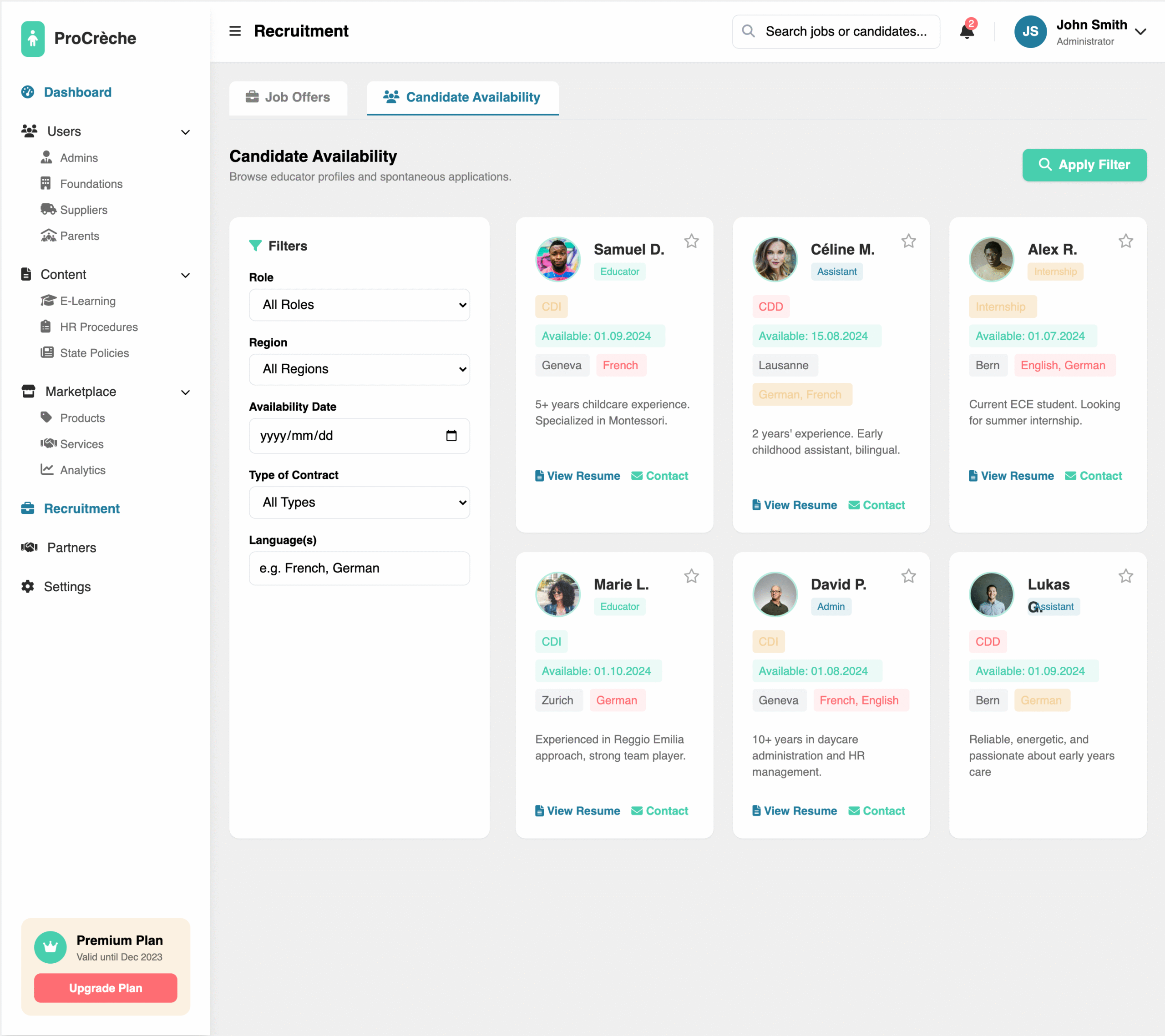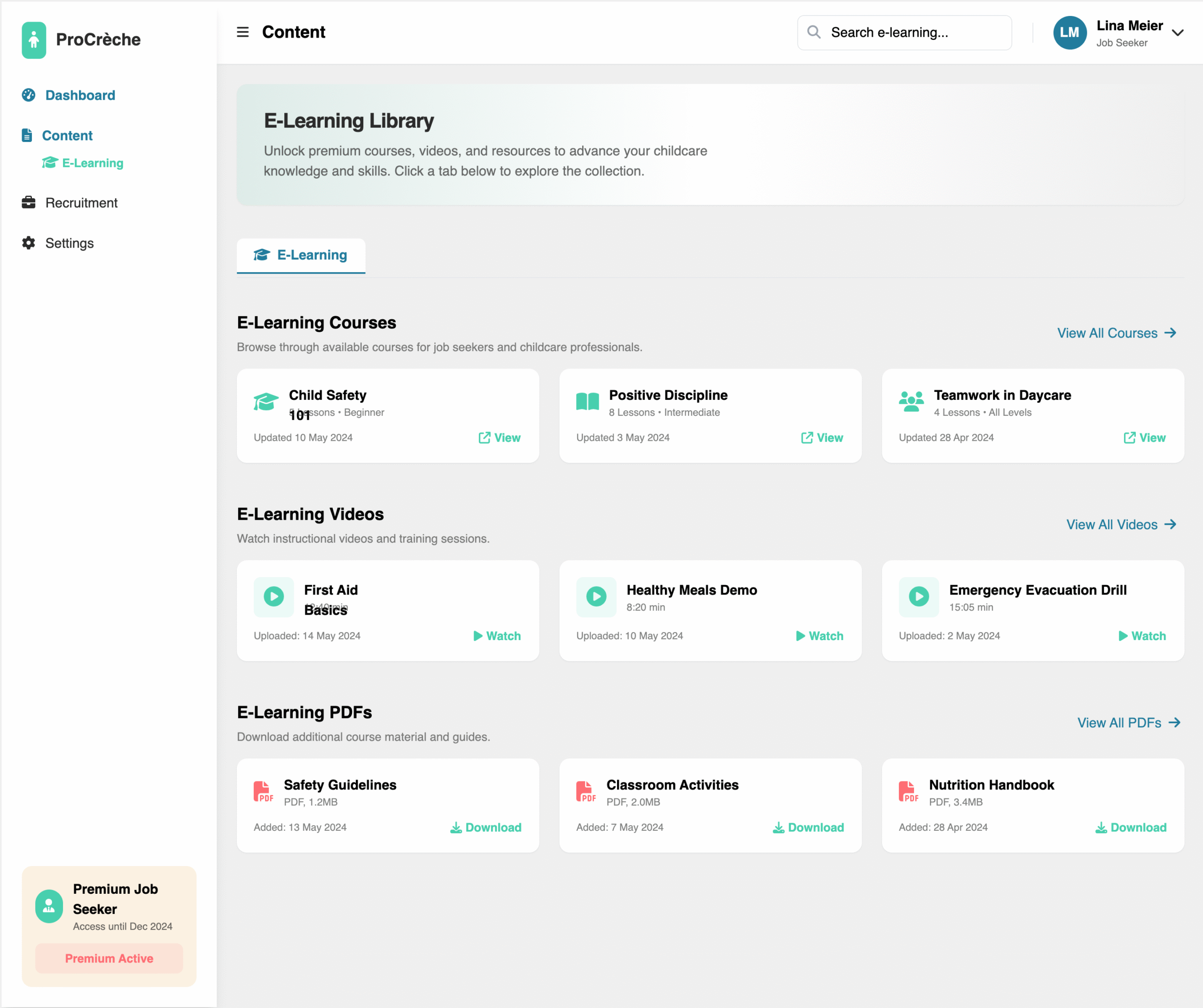 Why it works: Leads work with location, age groups, start dates and real parent preferences. A focused talent pool of assistants and educators with relevant experience. Supplier listings that fit daily crèche operations, offering discounted rates. HR Templates and state policy updates.